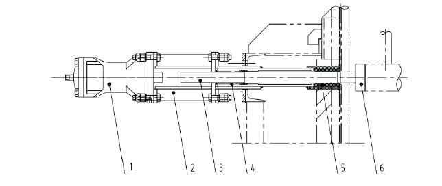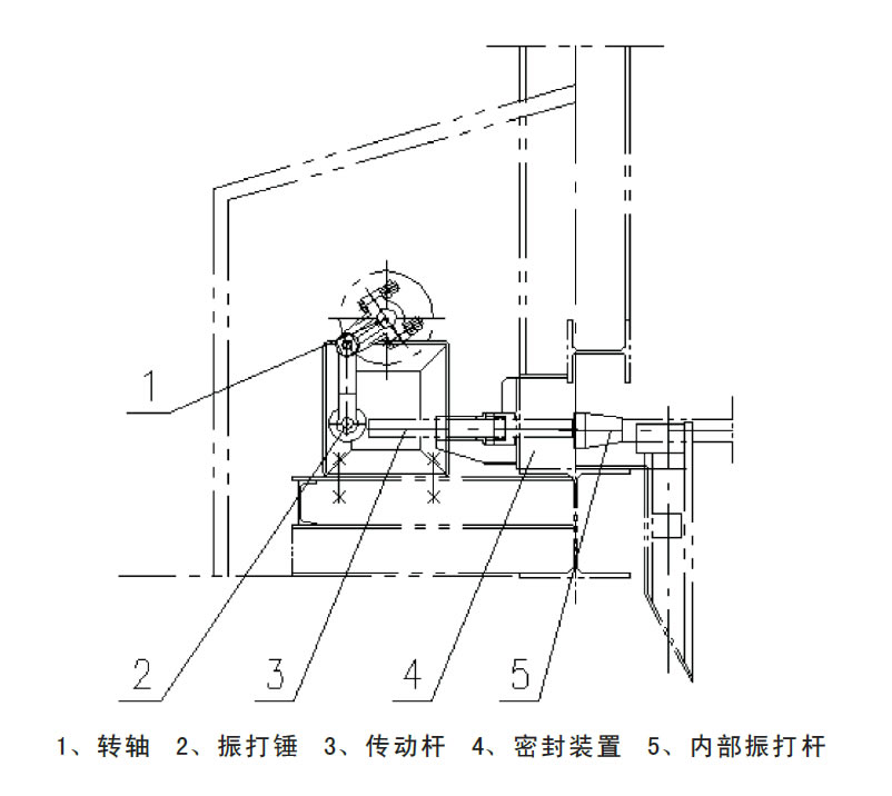 1、气动锤 2、固定座 3、传动杆 4、弹簧 5、密封材料 6、内部振打座